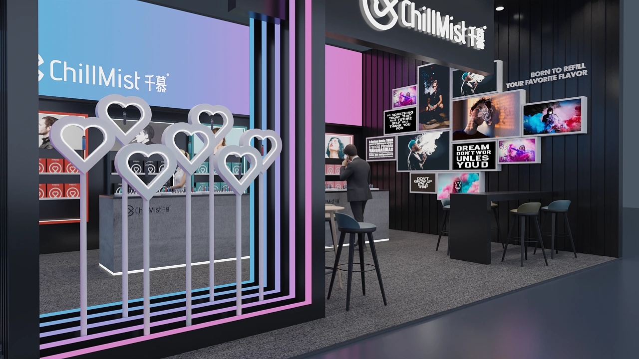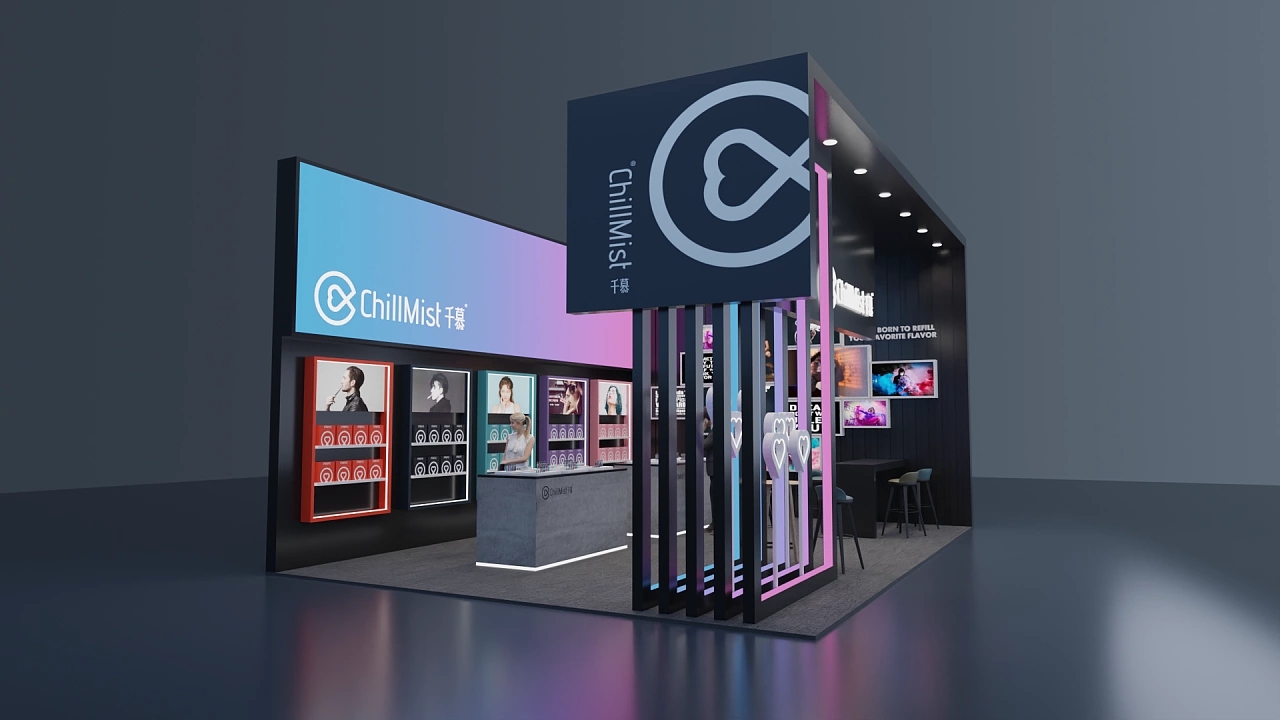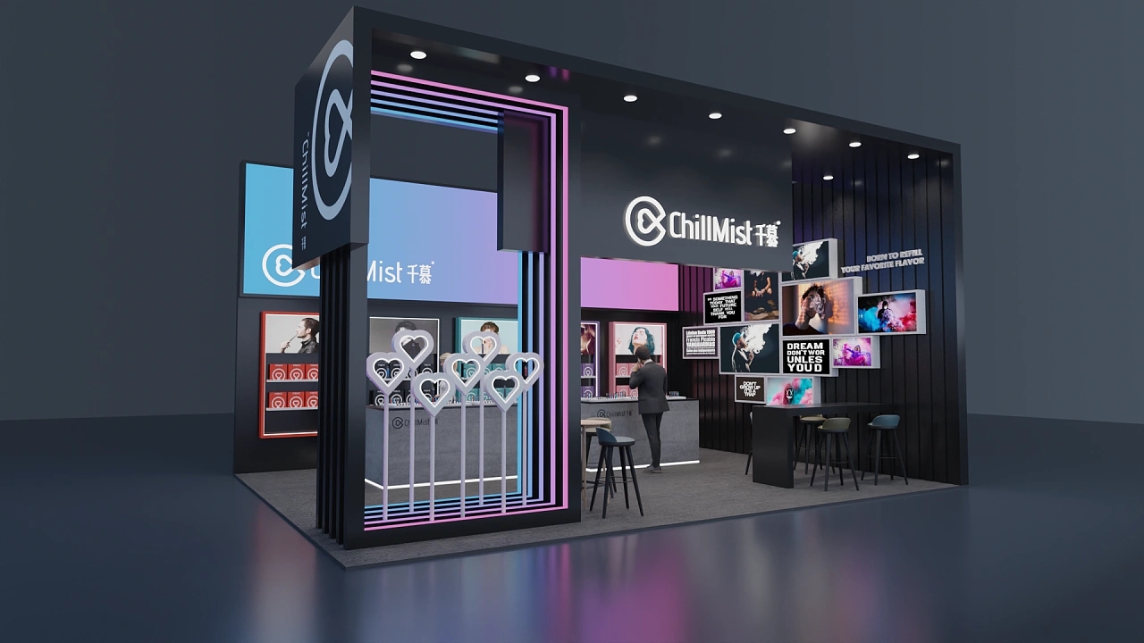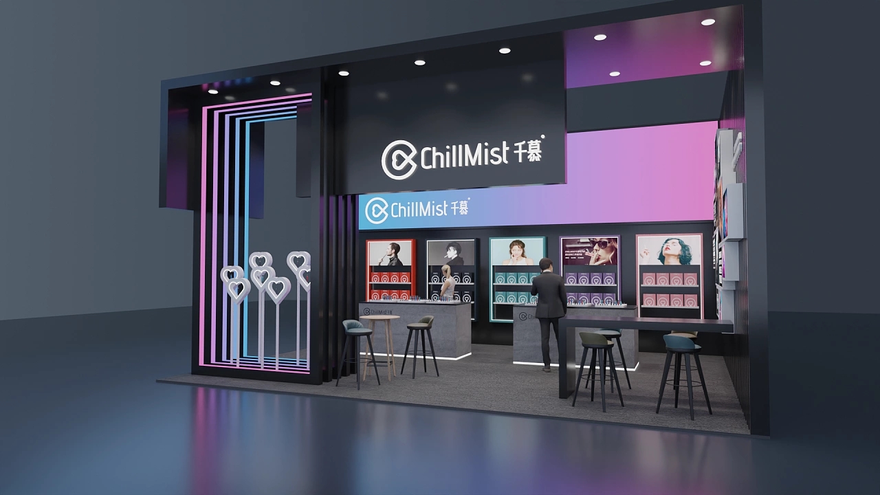 該展臺大小為56平,通過在黑色上粉藍色的漸變色彩打造展臺設計中的亮點,該展位展臺設計采用了兩面開的方式,其中一面墻上布置了錯落有致的畫框,用于展示企業的參展展品和企業價值觀,另一面墻排列了參展商的各類產品以及體驗臺,讓與會觀眾能更直觀體驗參展的產品,提高產品的成交量。整個展臺向參展觀眾展示了潮酷、現代的視覺感受。