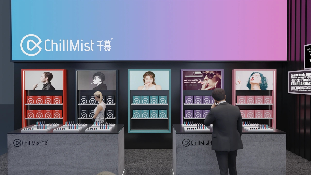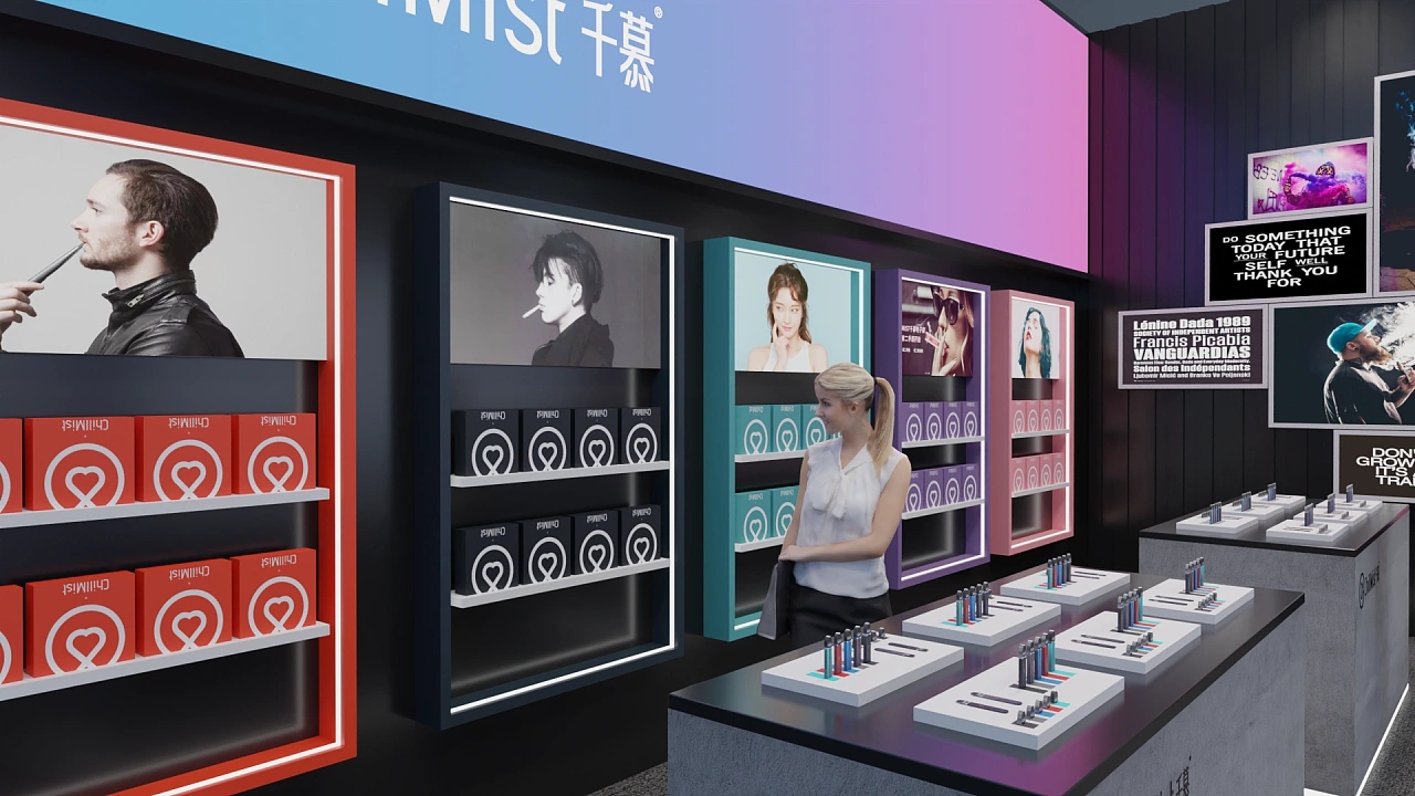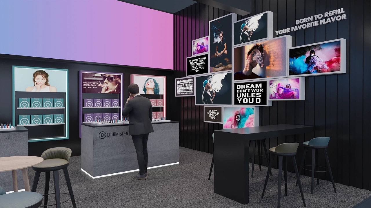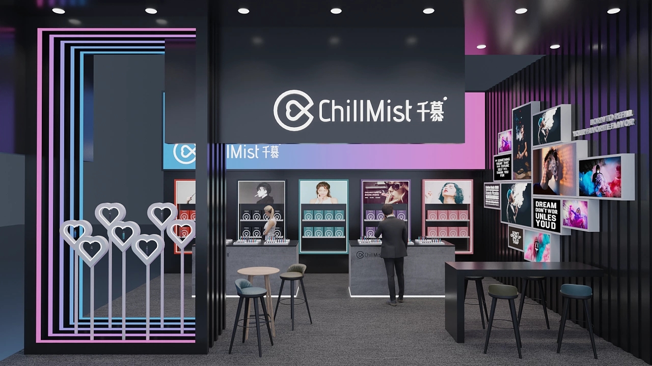 該展臺大小為56平,通過在黑色上粉藍色的漸變色彩打造展臺設計中的亮點,該展位展臺設計采用了兩面開的方式,其中一面墻上布置了錯落有致的畫框,用于展示企業的參展展品和企業價值觀,另一面墻排列了參展商的各類產品以及體驗臺,讓與會觀眾能更直觀體驗參展的產品,提高產品的成交量。整個展臺向參展觀眾展示了潮酷、現代的視覺感受。