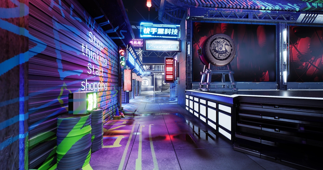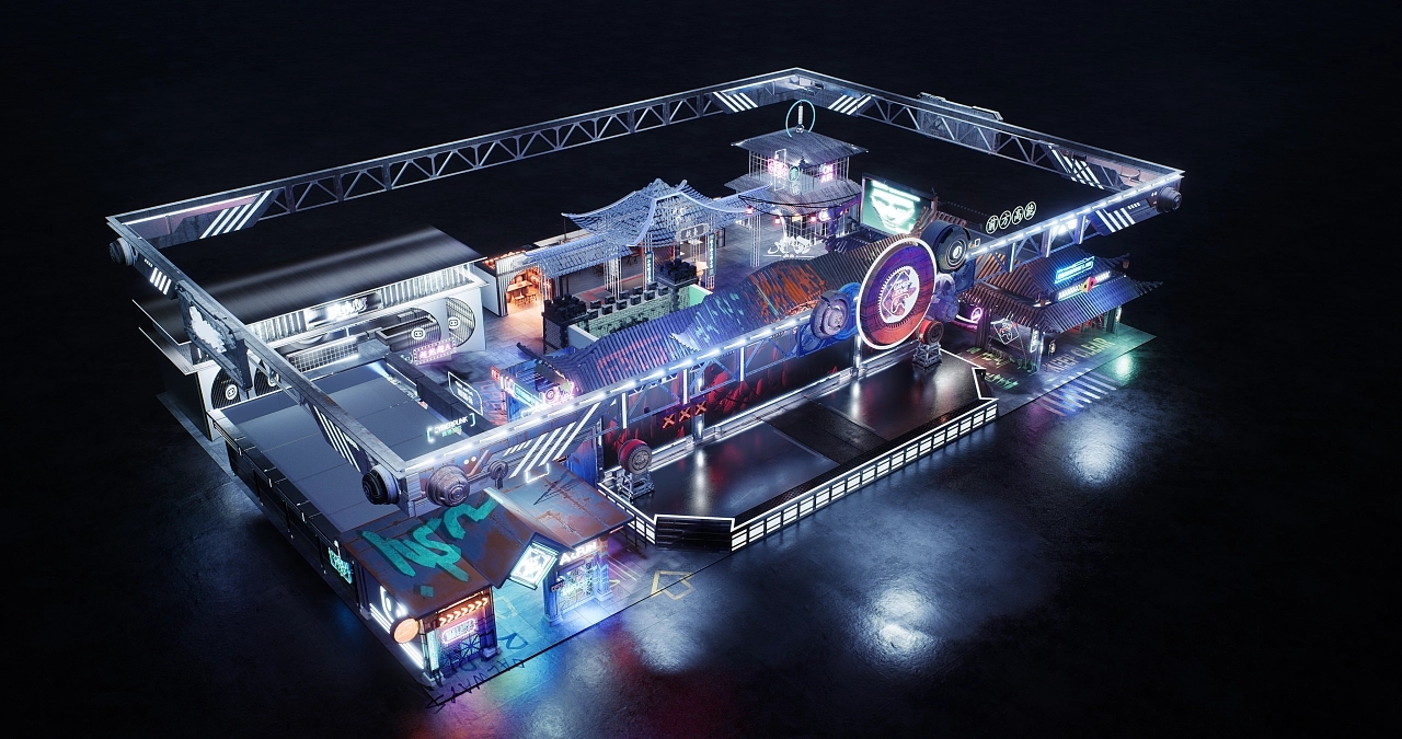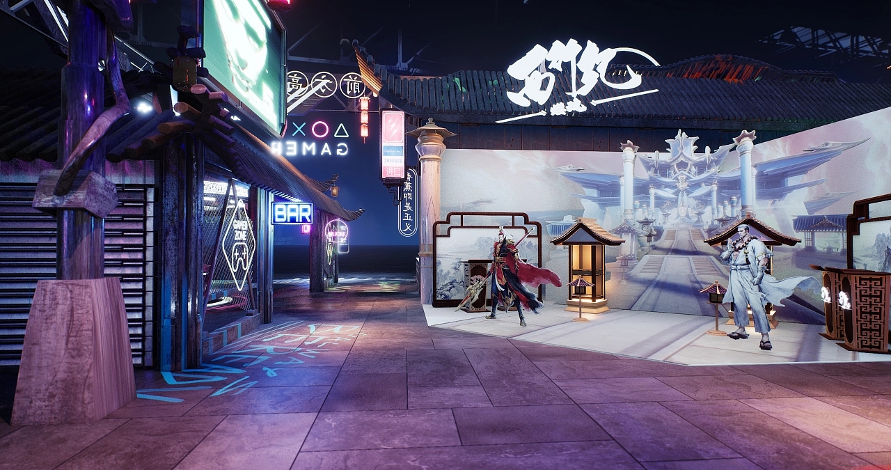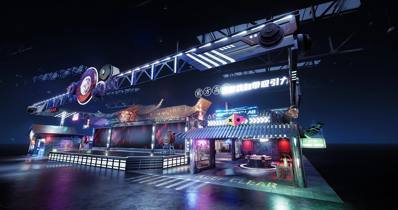 展臺設計搭建了一個國風賽博朋克式的展臺造型。不同顏色和造型的發光字交錯分布在展臺的每個角落,令參展觀眾仿若進入游戲世界當中,國風的建筑與現代感的燈光結合在一起,增加了時空的錯亂感和游戲的真實感,給人沉浸式的空間氛圍感受。